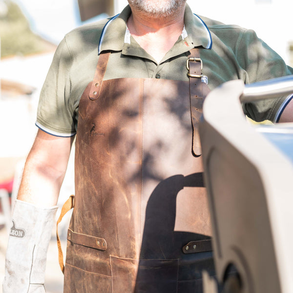 Aus echtem Leder gefertigt, entwickelt jede Weste mit der Zeit ihre ganz eigene Patina – für Charakter, der mit jedem BBQ wächst.