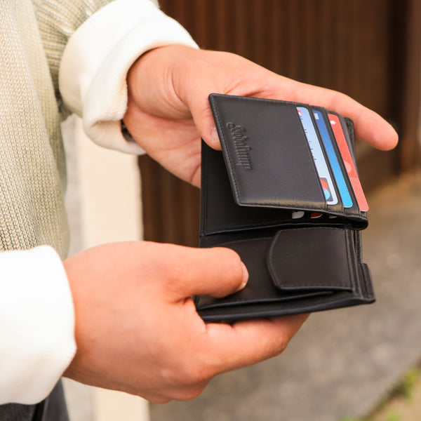 Die Hodalump Sim BLACK 2.0 ist der Inbegriff von Stil, Funktionalität und Qualität. Gefertigt aus hochwertigem Echtleder und in der exklusiven Black Edition, setzt sie neue Maßstäbe für Business-Geldbörsen. Die Steinbock Edition vereint alles, was du von einer eleganten Geldbörse erwartest – viel Platz für Karten, Scheine und Münzen bei gleichzeitig schlankem Design.