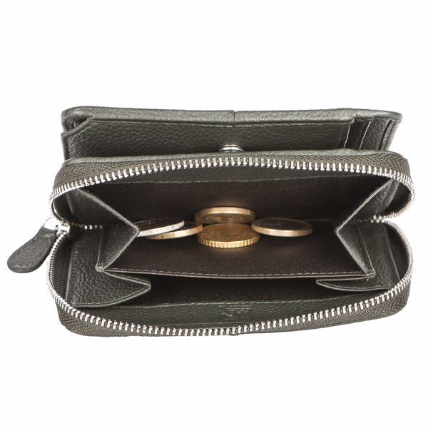 Im Inneren bietet sie eine durchdachte Aufteilung: mehrere Kartenfächer, ein geräumiges Scheinfach sowie ein sicheres Münzfach mit Druckknopf. Alles findet seinen Platz – übersichtlich und schnell griffbereit. Die mittelgroße Form macht sie angenehm handlich, ohne Kompromisse bei der Funktionalität einzugehen.