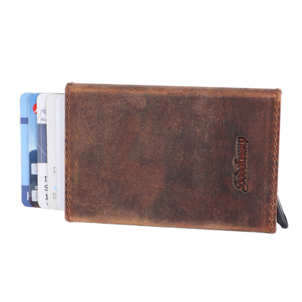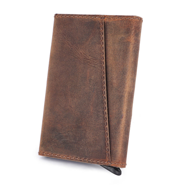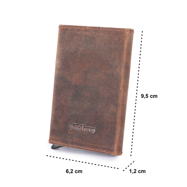 Das Herzstück ist der integrierte Kartenmechanismus, mit dem du deine Karten per Knopfdruck gestaffelt herausschiebst. So hast du sofort Zugriff – ohne Kramen, ohne Zeitverlust. Zusätzlich bietet das Etui Platz für Geldscheine oder Visitenkarten und liegt dank seiner schlanken Bauweise angenehm in der Hand.
